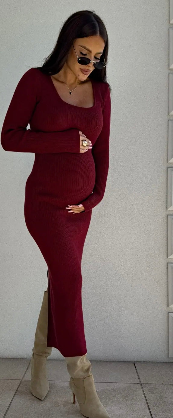 Sukienka o długości midi, wykonana z wysokiej jakosci, elastycznej przędzy o prążkowanej strukturze. Model z dekoltem karo i długimi rękawami doskonale podkresla sylwetke, zapewniając jednocześnie komfort noszenia. Subtelne rozcięcie z tyłu dodaje całości kobiecego charakteru i ułatwis swobodne poruszanie się. Idealna zarówno na co dzień , jak i na bardziei formalne okazje.